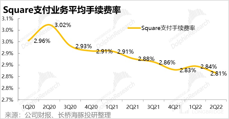 由于 Square 支付手续收入增速低于 GPV 增长,可以推断支付手续费率有所下行。经长桥海豚君推算,本季度支付业务平均手续费率继续下滑到 2.81%,处于持续下行周期中。不过这也符合海豚君先前的判断:随着公司服务的中大型商家增长,支付手续费率会持续下降。