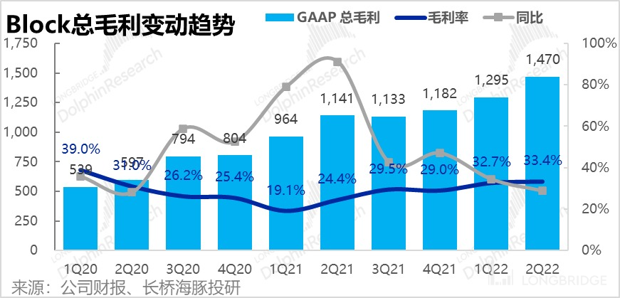 - 以联名银行卡业务和即时提现业务 (至银行账户) 为主的订阅和服务收入本季为 6.16 亿元,同比增长 24%,与上季度增长 28% 相比并未明显放缓。今年早先时候,Block 将用户即时取现的手续费率的上限由 1.5% 提高到 1.75%,并设置了 0.25 元每笔的最低收费。于此同时 PayPal 旗下的移动钱包 Venmo 也将即时提现费率由 1.5% 提升至 1.75%。