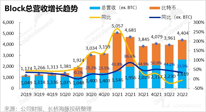 1.加总上述各项业务,本季公司总营收 44 亿美元,同比下降 5.9%,不过略高于市场预期的 43.4 亿元,主要是因为比特币业务超预期的表现。剔除波动巨大的比特币业务后,公司营收 26.2 亿元,可比营收增速为 34%,但略低于预期的 26.5 亿美元。