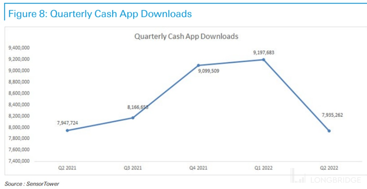 在经营数据上,虽然公司尚未披露官方月活数据,不过从第三方的调研数据也能让我们一窥 Cash App 的用户增长情况。据 SensorTower 统计,今年二季度 Cash App 的下载量在经历了 2021 年底-2022 年初的暴涨后已明显回落到与去年二季度一致的水平。可见在宏观经济变差的情况下,Cash App 的用户增长应当也有所放缓。