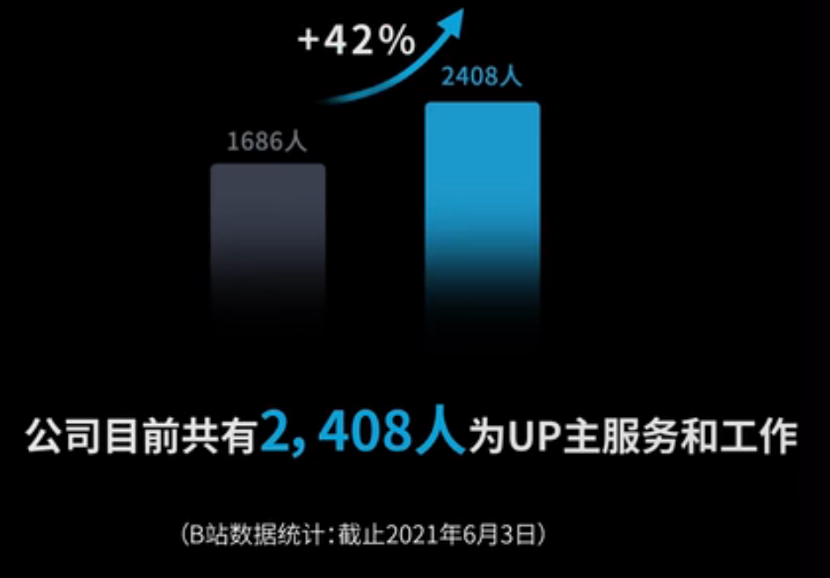 与此同时,B站也在尽可能地让平台更多元化。B站最宝贵的资源之一就是up主,这一点在B站12周年的分享中,也得到了印证,陈睿认为服务up主,是B站最重要的工作,没有之一,公开数据显示,2021年B站9500名员工里,有2408人全职为up主服务,这个数量同比去年提升了42%。