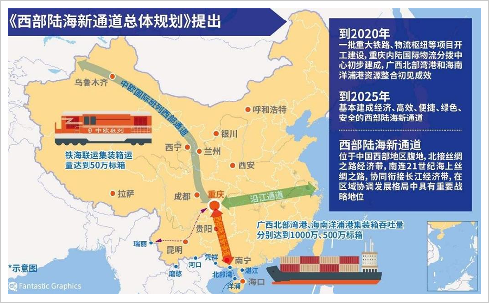 2019年8月,发改委出台《西部陆海新通道总体规划》,通道被正式定名为“西部陆海新通道”,提升为国家战略。