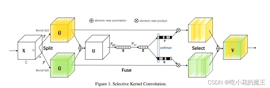 原文:'为了使神经元能够自适应地调整它们的 RF 大小,我们提出了一种自动选择操作,即“选择性内核”(SK)卷积,在具有不同内核大小的多个内核中。具体来说,我们通过三个运算符实现 SK 卷积——Split、Fuse 和 Select,如图 1 所示,其中显示了两个分支的情况。因此在这个例子中,只有两个内核大小不同的内核,但是很容易扩展到多个分支的情况。'