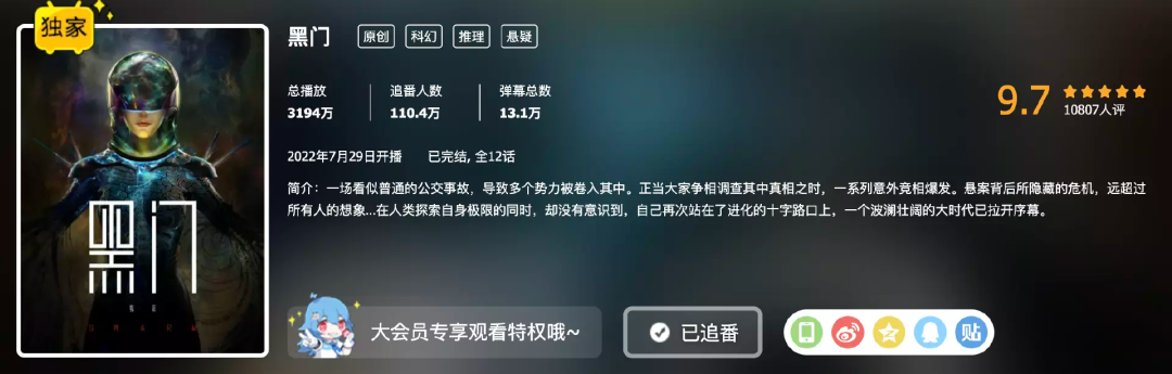 原创动画《黑门》在bilibili评分9.7,是几部科幻动画中评分最高的作品,但热度很低。虽然已经完结两个月,但只有110万追番,专辑播放量3194万,数据还不如《三体》动画的花絮。小说改编科幻动画《银河之心》更新8集bilibili评分5.7、《无限世界》更新4集bilibili评分8.1,在画面剧情等多方面都受到了观众的质疑。