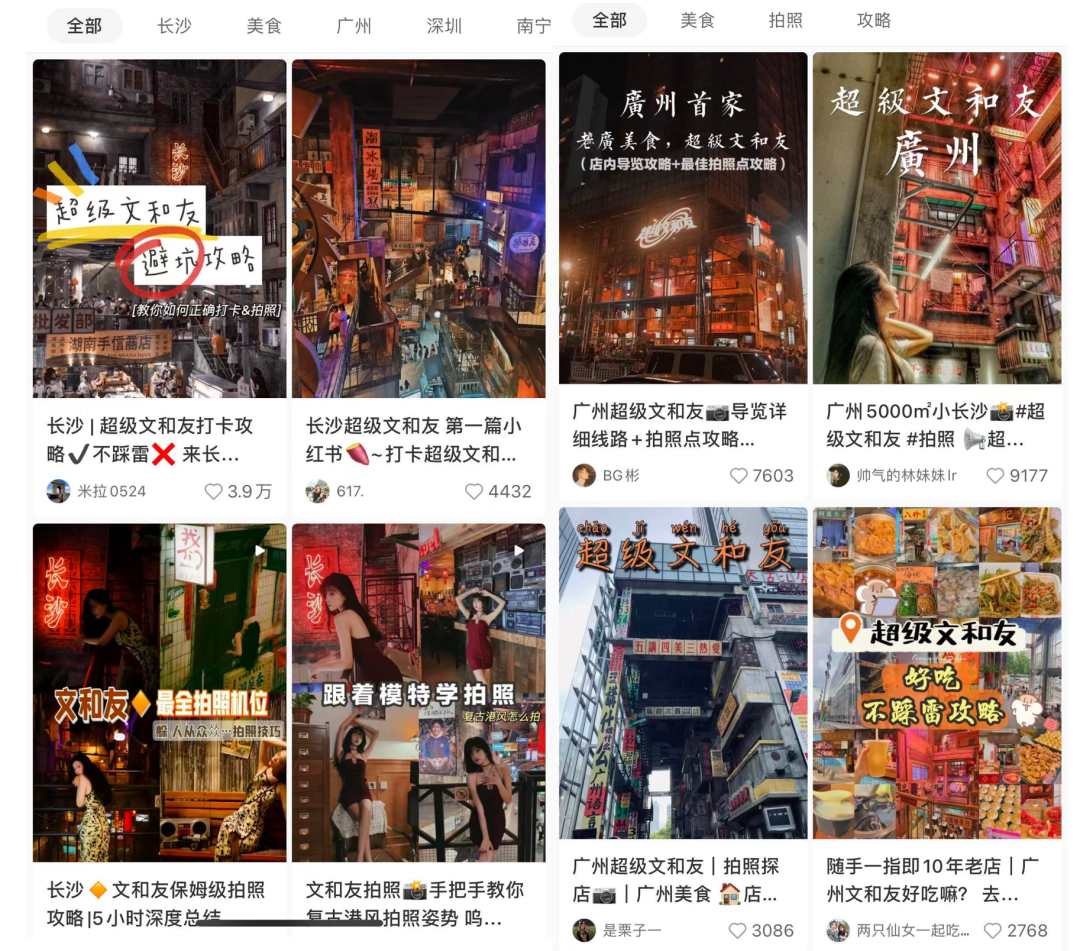 线下的热潮很快便弥漫到线上。在小红书搜索文和友,会发现无论是广深还是长沙店,都充斥着琳琅满目的打卡攻略、避坑攻略、探店秘方。仅搜索长沙文和友,相关笔记就超6万条,单条笔记的点赞量随随便便破万,瞬间成为流量新宠。