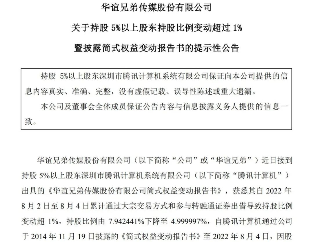 近日华谊兄弟在公告中宣布,持股5%以上的股东深圳市腾讯计算机系统有限公司,自2022年8月2日至8月4日,累计通过大宗交易方式和参与转融通证券出借导致持股比例变动超1%。