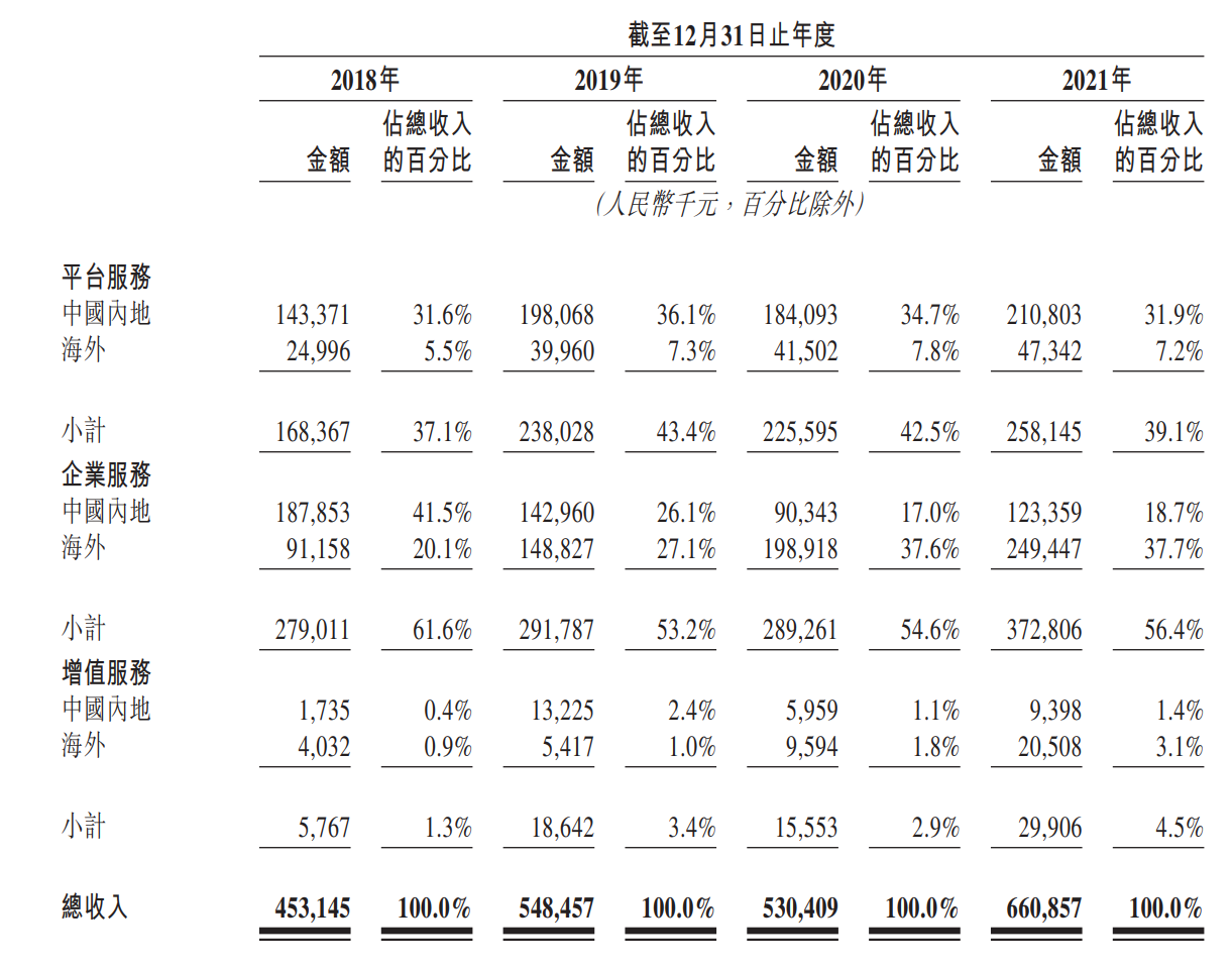 2018 年、2019 年、2020 年、2021年,企业服务占总收入的比重分别为 61.6%、53.2%、54.6%、56.4%,平台服务的占比在 30%-40% 左右浮动,增值服务的占比在 1%-3% 左右。