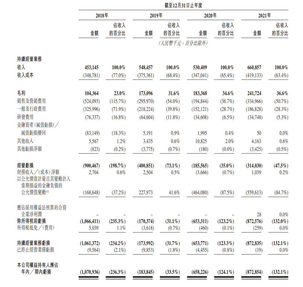 招股书数据显示,2021年快狗打车在销售和营销费用方面投入了3.35亿元,同比增长了71.79%,这一费用占去年总营收的50.7%。 2021年之前,快狗打车在销售和营销费用上的投入同样居高不下。2018-2020年,快狗打车在这部分费用的投入分别为5.24亿元、2.96亿元和1.95亿元,分别占当年总营收的115.7%、54.0%和36.7%。