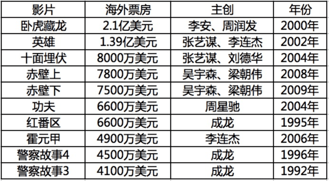 因此便有了后面张艺谋的《英雄》、《十面埋伏》等武侠巨制,纷纷在整个海外引起波澜,其中《英雄》更是拿到了北美两周冠军。但猎奇所带来的票房毕竟是有限的,且是不可持续的。2006年李连杰主演的《霍元甲》则成为了最后的终结篇章,经历了十余年的疯狂输出之后,功夫片终于把海外观众喂饱了。