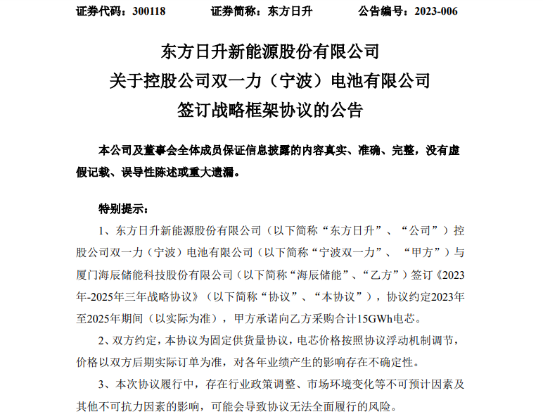 钛媒体APP注意到,庄英宏提及的储能订单系东方日升1月9日发布的公告。当时公告显示,东方日升与控股公司宁波双一力与海辰储能签订《2023年~2025年三年战略协议》协议约定2023年至2025年期间(以实际为准),宁波双一力承诺向海辰储能采购合计15GWh电芯。不过,公告并未提及庄英宏所说的“4吉瓦时”。