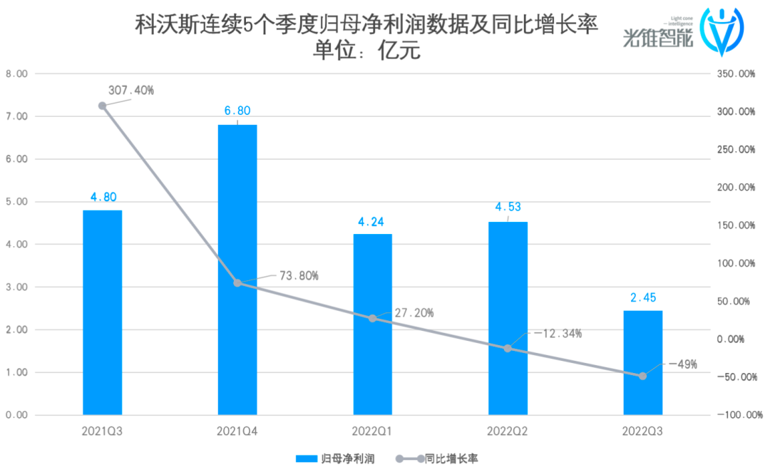 从归母净利润来看,在2022年第二季度出现2年来首次负增长以后,第三季度的归母净利润为2.45亿元,同比下降48.94%。