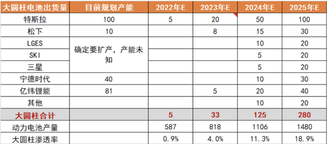 而4680电池,天风证券预计2023/2025年全球大圆柱电池出货33/280GWh,在动力电池渗透率4.0%/19%。其中,特斯拉2022年出货为5GWh,2025年能达到20GWh。