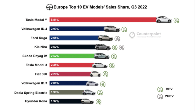 特斯拉全球三大市场中,欧洲市场随着上海工厂出口恢复正常以及柏林工厂产能逐渐释放,三季度欧洲地区供需矛盾得以缓解,市占率快速回升,Model Y更是一骑绝尘成为最畅销的电动汽车。
