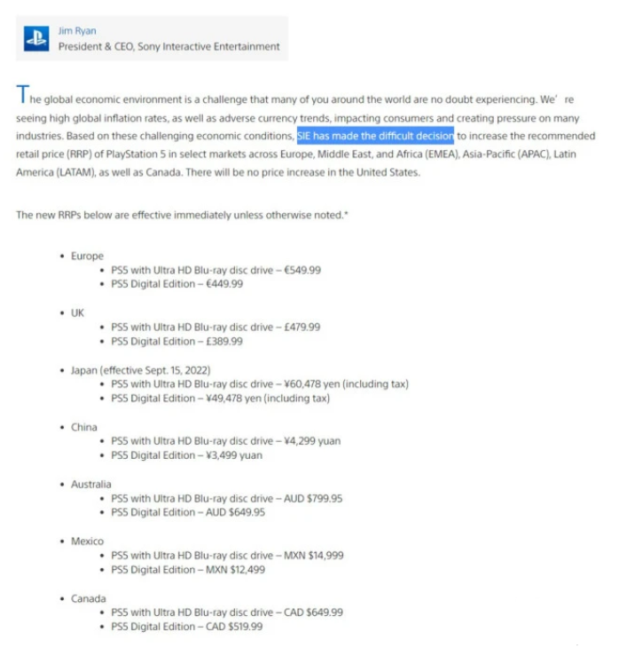 但是,当全球供应链逐渐恢复,PS5终于在发布一年半后回归官方定价时,索尼互娱的涨价公告却给了玩家当头一棒,官方定价上涨与商家定价上涨的意义是截然不同的,特别是在PlayStation系列游戏主机上。