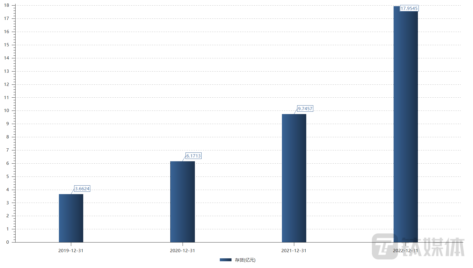 年报显示,2019年—2022年公司存货余额分别为3.66亿元、6.17亿元、9.75亿元与17.95亿元,资产百分比分别为4.67%、6.24%、9.09%与19.05%,存货周转率分别为6.66、6.49、3.72、1.31。而到今年一季度存货周转率更是降至0.31。