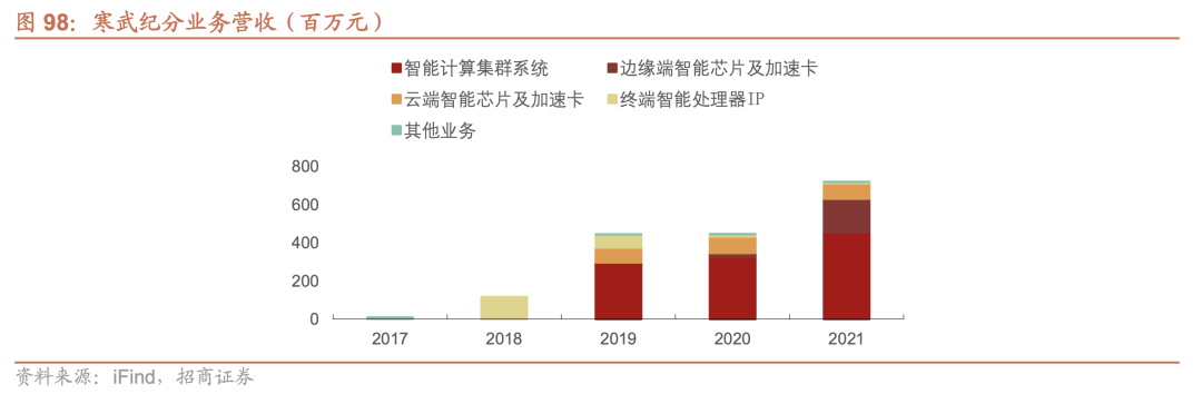 2021年全年,寒武纪营收大头转而成为了边缘智能芯片及加速卡,前一年贡献了公司70.96%营收的智能计算集群系统,在这年的营收只有158万元。