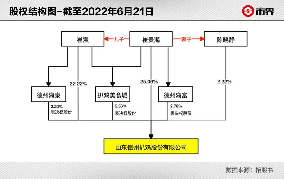 截至签署招股书,扒鸡股份实际控制人为崔贵海家族,其与儿子崔宸、妻子陈晓静合计控制扒鸡股份60.06%的表决权股份。1996年,崔贵海就进入改制前的扒鸡总公司工作,历任副总经理兼总会计师、副董事长等职,2010年至今任扒鸡股份董事长,崔宸现任扒鸡股份副董事长、总经理,陈晓静不在公司任职。