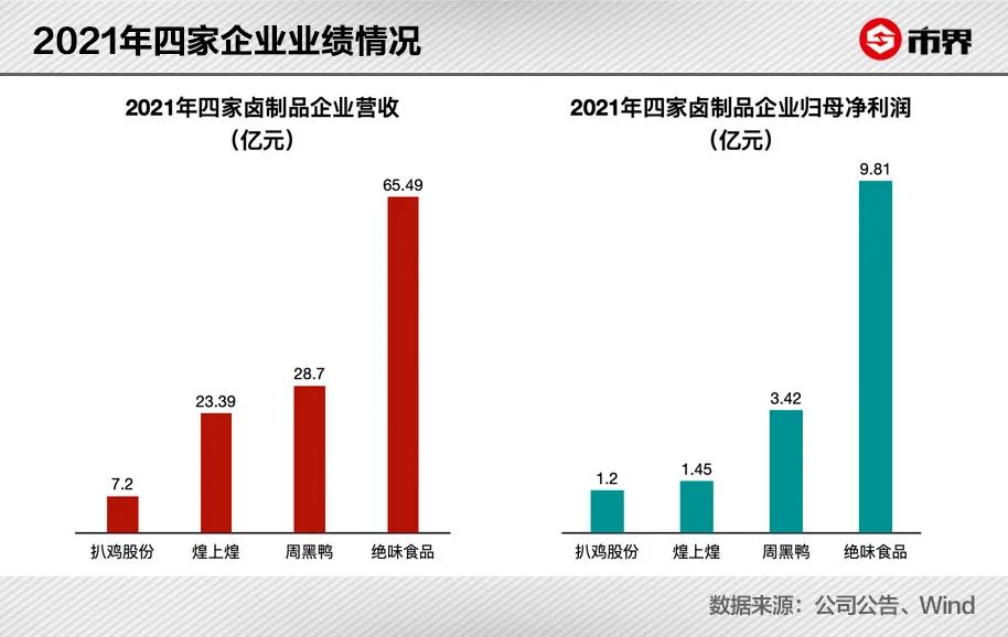 2021年,扒鸡股份营收为7.2亿元,而煌上煌营收23.39亿元,周黑鸭为28.7亿元,绝味食品的营收更是达65.49亿元。这三家的营收分别是扒鸡股份的三倍、四倍、九倍。