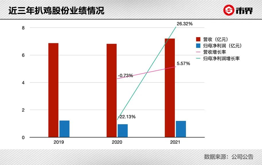 2020年,扒鸡股份营收和净利润均出现负增长;2021年,扒鸡股份营收同比增长了5.57%,归母净利润同比增长了26.32%,而绝味食品、周黑鸭的的营收增速为24%、32%,归母净利润增速分别为40%、126%。