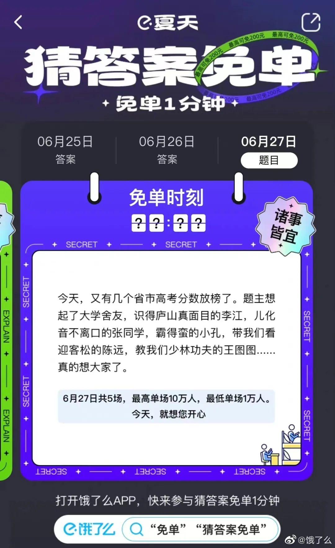 6月27日一早,饿了么“免单一分钟”就给出了今日免单的新线索:今天,又有几个省市高考分数放榜了,题主想起了大学室友,识得庐山真面目的李江,儿化音不离口的张同学,霸得蛮的小孔,带我们看迎客松的陈远,教我们少林功夫的王图图。真的想大家了!