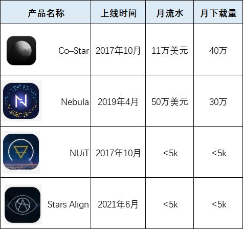陌生人社交这边,在欧美市场也曾出现过多款打着“星座配对”旗号为交友的 App,不过几乎都是昙花一现。从 2017 年上线的 NUiT、到后来的 Stars Align 等等,当以“Astrology Dating APP”为关键词在 Google 搜索时能找到类似的 App 不下 10 款。但在产品形态打不出太大差异的情况下,它们在下载数据和营收数据上均表现得非常惨淡。
