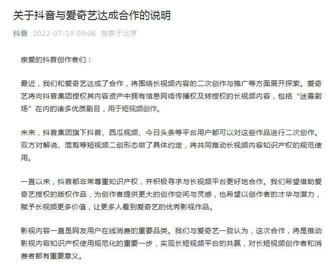 7月19日,爱奇艺和抖音集团宣布达成合作,将围绕长视频内容的二次创作与推广等方面展开探索。
