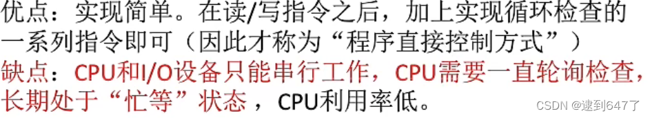 采用轮询的方式不断检查状态寄存器状态,CPU干预频率高,每次读/写一个字。
