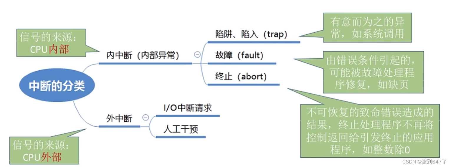 中断分为内中断(与当前执行指令有关)和外中断(与当前执行指令无关)