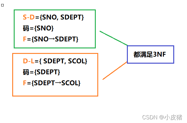 ** 分解后的关系中不再存在传递函数依赖,即关系模型S-D和D-L都满足3NF**