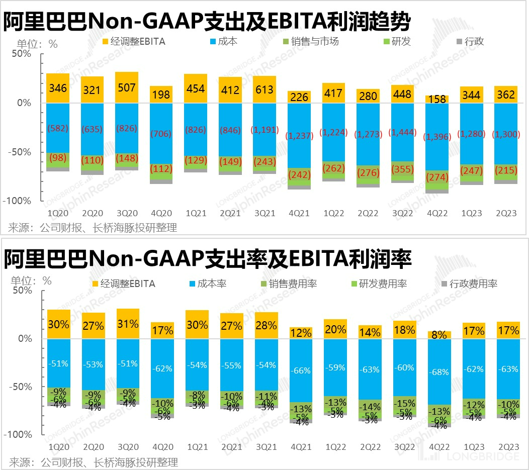 这样在收入不及市场预期的情况下,阿里狂省销售费用,最终在市场最为关注的利润指标——调整后 EBITA 利润上达到了 362 亿,远远超出了市场预期的 334 亿。