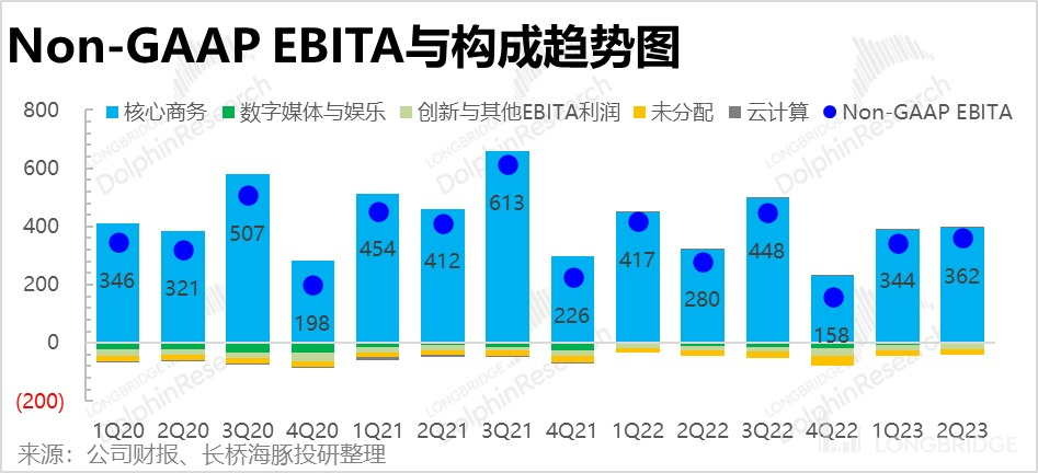 这个季度国内商务不考虑期权激励、摊销费用的利润(经调整 EBITA)达到了 440 亿,利润率 32%,无论是同比环比都有明显提升。