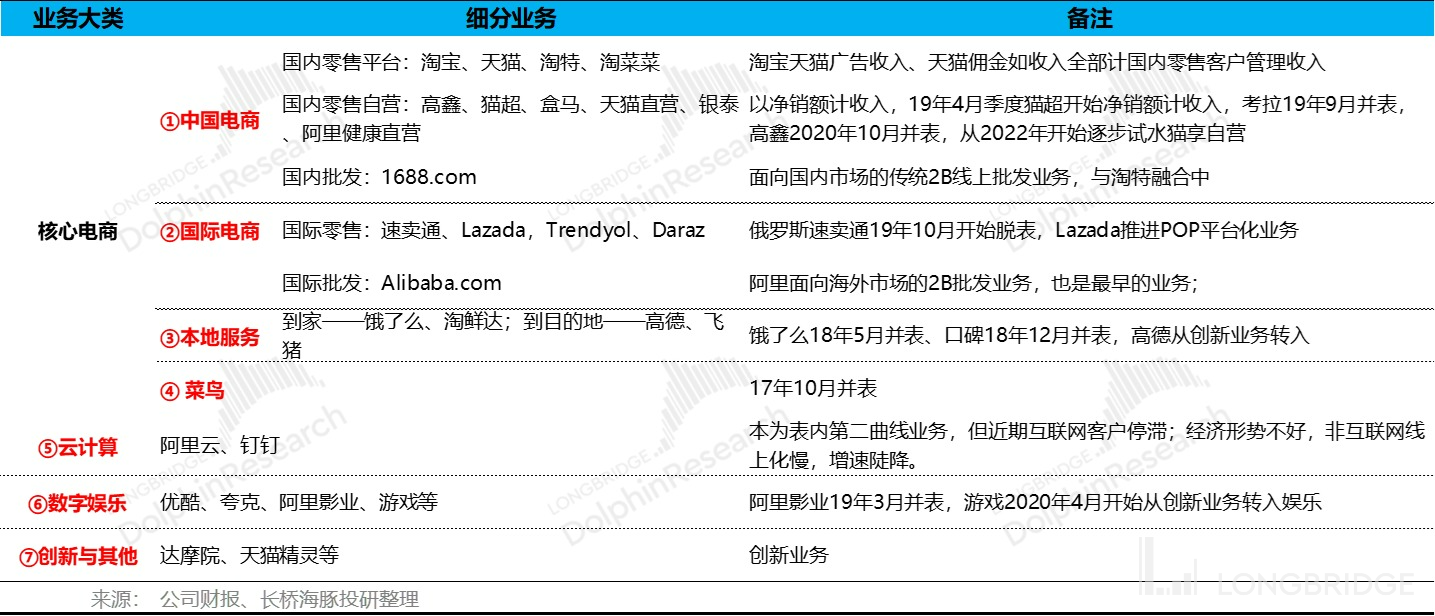 特别提示:从 2021 年 12 月的季度开始,阿里调整财报的露口径。海豚君把阿里最新业务做了分类整理,方便大家在看解读的时候,随时回溯,红色为最新的披露列示条目。