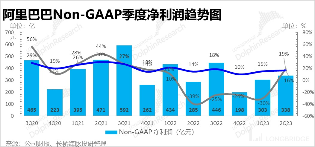 调整后净利润 338 亿,同样大幅超出市场预期 304 亿;净利润同比增长在经过了一整年接近 30% 的收缩之后,终于回到了正增长的路上,本季度同比增长 19%。