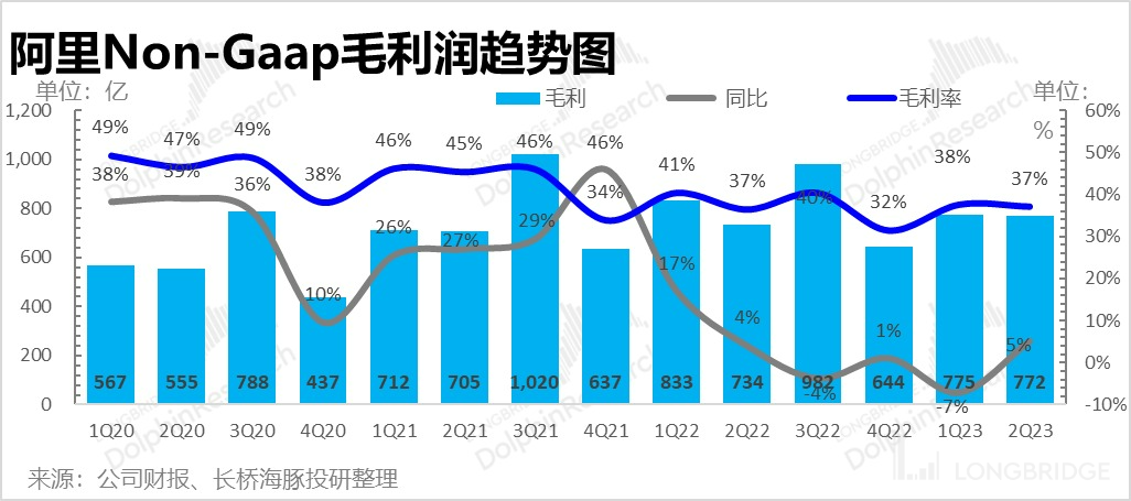 由于花钱不再大手大脚,阿里本季度剔除掉股权激励的 Non-GAAP 毛利 772 亿,同比增长 5%;毛利率在低毛利自营收入占比同比环比都在加大的情况下,环比基本稳住,同比还有改善,明显超出了市场预期,这应该是自营业务,譬如盒马毛利率的改善,起到了很大的作用。