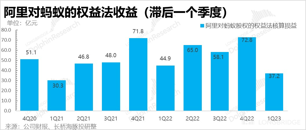 这个季度阿里计入蚂蚁得权益法收益只剩 24 亿,按照 33% 的股权占比,相当蚂蚁利润应该只有 72 亿,同比下滑了 64%,不止腰斩。这里除了蚂蚁本身运营利润的缩水,还有蚂蚁所投资产公允价值的下滑。