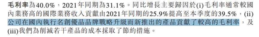 比如,名创优品财报中提到,2022年第四季度的整体毛利率为40%较21年同期提高,其中的一个原因就是国内执行品牌战略升级推出高毛利产品。