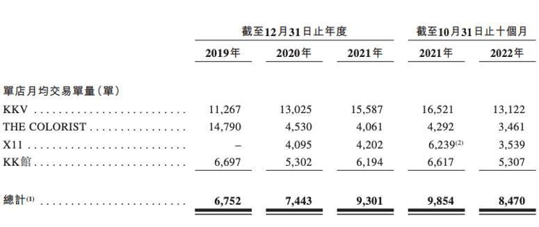 招股书显示,KK旗下4个品牌的单店交易全部下滑,下滑最严重的是潮玩X11门店,从2021年的6239单下滑43%到3539单,单店月均GMV从1010万下降到531万,KKV、调色师、KK馆单店交易单量下滑比例分别为21%、19%、20%。