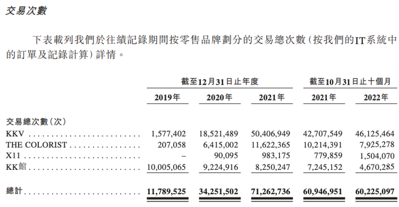 2022年前十月,KK总交易次数为6023万次,较去年同期的6095万次小幅下滑。KK旗下4个品牌,KKV和X11交易次数有增长,而调色师和KK馆交易次数下滑,下滑比例分别为23%和36%。