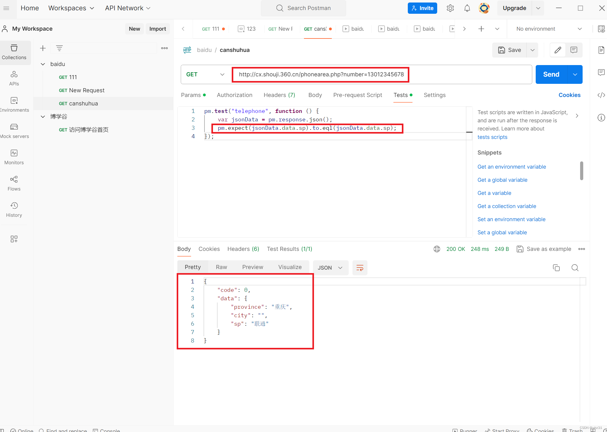 测试一个手机号的时候可以这样操作,当测试多个手机号的时候,就可以使用参数化的方法来进行测试。