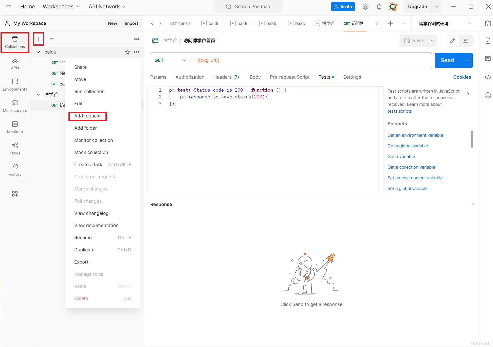 2.然后点击+,点击blank collections,点击三个点,创建请求add request可以修改成需要的名字。