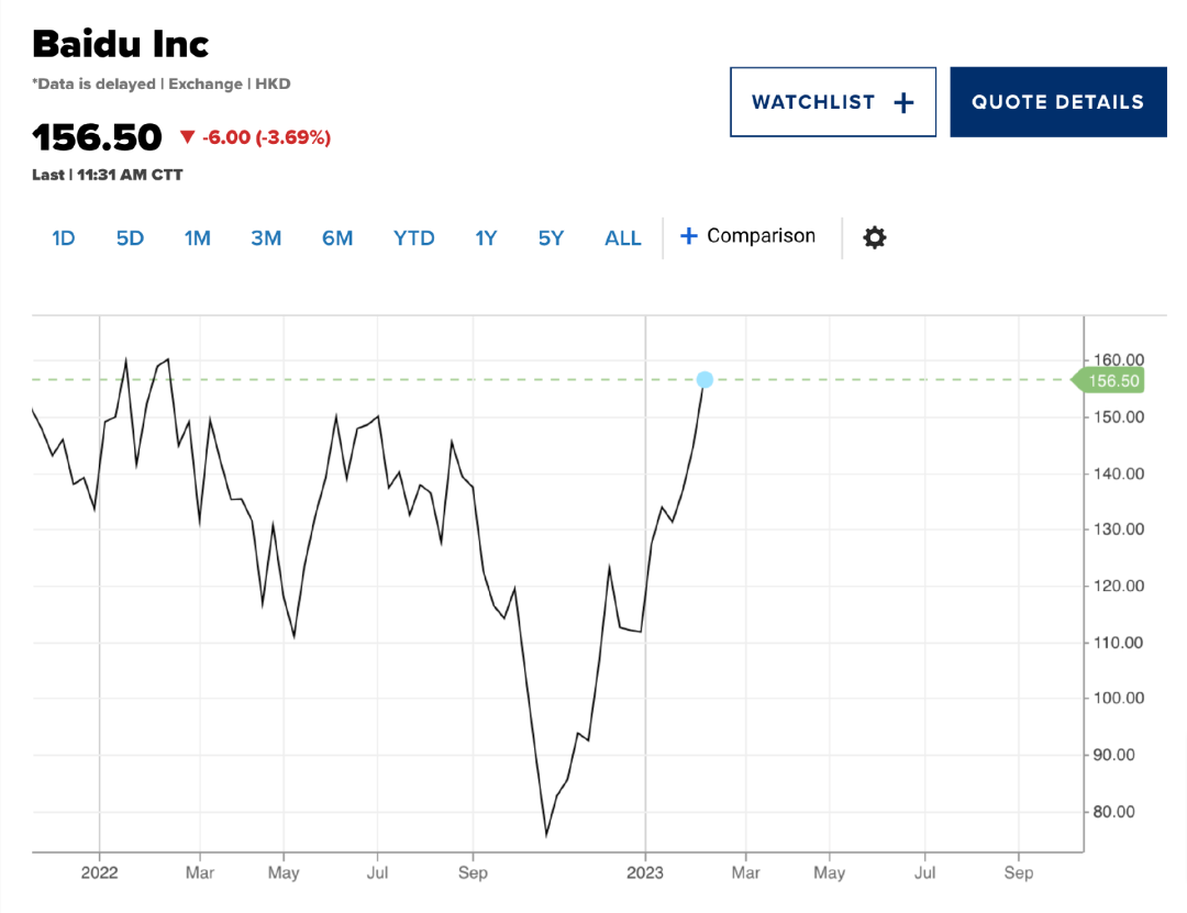 百度官宣3月份完成内测类ChatGPT产品“文心一言”后,盘中最高涨超18%,股价自去年10月最低点以来涨超过125%,创下自2021年11月以来最高涨幅。