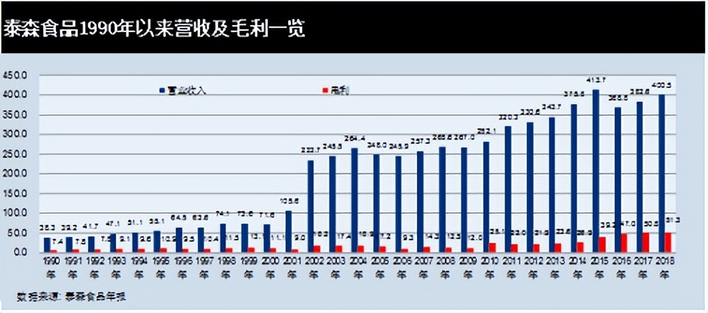 2001年,泰森食品收购了IBP, inc.,泰森超越鸡肉业务成为当时世界上最大的鸡肉、牛肉和猪肉加工商和销售商(鸡自己养殖,牛和猪从养殖户手中收购然后再处理)。