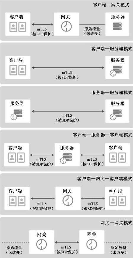 客户端—网关—客户端模式是客户端—服务器—客户端模式的变形,该模式支持对等网络协议,要求客户端在执行SDP访问策略时直接进行连接。