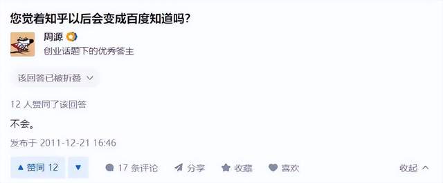 毕竟他还“惨”遭过内部工作人员的处罚。比如在“你觉得知乎会变成百度知道”的问题下方,积极参与的周源只是简单写下了“不会。”——尽管后来事实证明,知乎与百度知道并没有所谓的殊途同归。但这都不重要。对于社区管理人员而言,这样的答案毫无建设性,于是,它的内容被折叠,也就是说,普通用户如果不去手动打开,甚至都看不到这条回答。