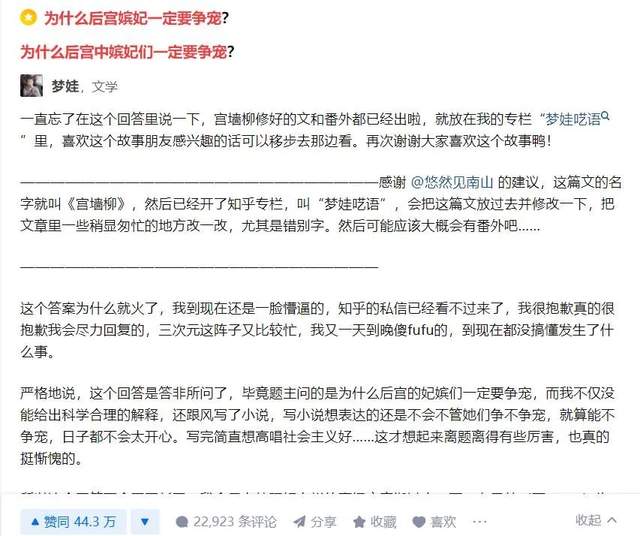 2019年春天,在问题“为什么后宫中嫔妃们一定要争宠?”下,一位ID名叫“梦娃”的创作者掀起的讨论,曾经引来知乎内部的关注。他们发现,“梦娃”更新的内容主要来自她在站外更新的一部网络小说,但知乎用户们很喜欢,如同催更小说一般,追问着相关的情节和人物。