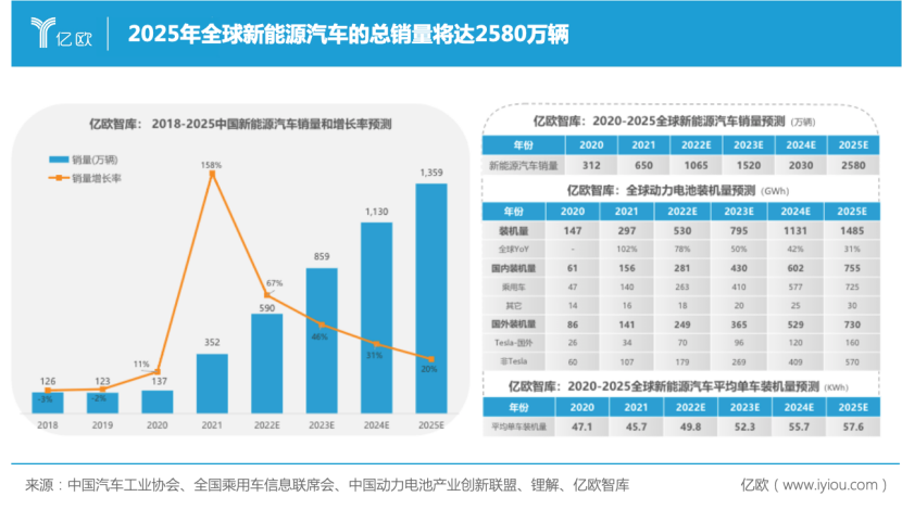 亿欧智库预测,到2025年全球新能源汽车的总销量将达2580万辆,同时2025年全球新能源汽车动力电池的装机量将达1485GWh,平均单车装机量57.6KWh。