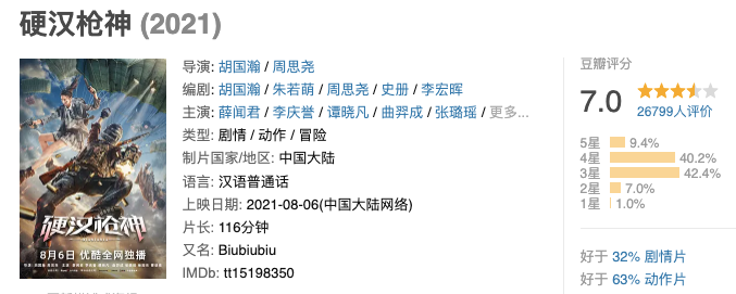 但一个比较矛盾的现象是,目前以单片付费模式上线的网络电影中,口碑最好的应该是豆瓣5.7分的《发财日记》,其余大都在4分乃至3分水平,但换个角度说,《硬汉枪神》《东北告别天团》口碑虽然更高,究竟有没有做单片付费的资格?本质上《倚天屠龙记》等电影的热度来自题材和明星知名度,以及这种知名度基础带来的更高的营销宣发预算,如果换成《硬汉枪神》《东北告别天团》这样的平民演员班底,恐怕更卖不出几张票吧。