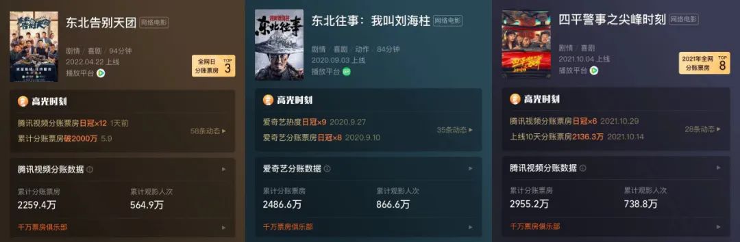 在Q1网络电影盘点中,读娱君解读了民俗网络电影崛起的原因和前景,本文就不多赘述了。《东北告别天团》4月22日上线后,至今已经突破2200万分账票房,是2022年以来分账票房最高的喜剧题材网络电影。《东北告别天团》的票房成绩直追2020年的《东北往事:我叫刘海柱》和2021年的《四平警事之尖峰时刻》,不难发现,这些在网络喜剧电影榜中位居前列的电影有一个共同点:东北喜剧元素。