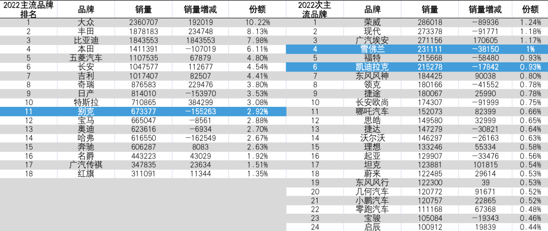 分品牌来看,上汽通用旗下有三款车型,分别是雪佛兰、别克和凯迪拉克。这三个品牌在2022年均出现了销量和市场份额双双下滑的情况。通过销量和排名的直接变化可以看到,上汽通用旗下所有品牌都呈现出竞争力下滑的趋势。