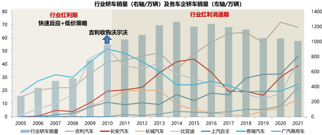 而2000-2010年这十年,正是轿车这一品类的红利期,期间自主品牌野蛮生长,吉利、奇瑞、比亚迪等得以崛起。